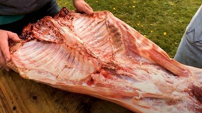 - Paso 2: En un mesón limpio, estiraremos la carne del cordero y agregaremos abundante sal sin miedo, recordemos que se trata de una gran pieza y hay que salarla bien, de todas formas, el exceso de sal caerá a medida que se asa el cordero.